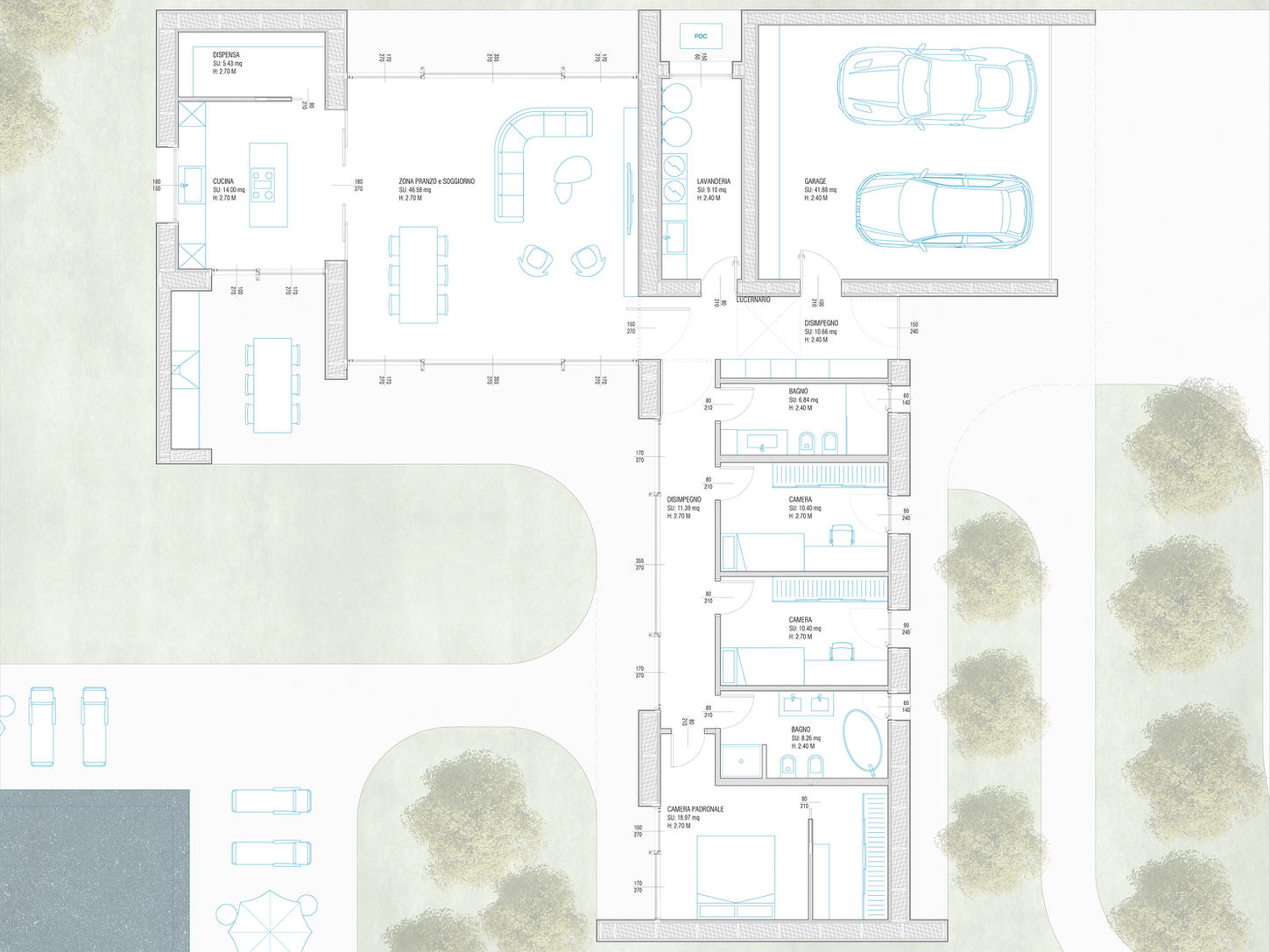 L’edificio si articola in due volumi distinti per zona giorno e zona notte, collegati da uno spazio filtro che comprende ingresso, autorimessa e lavanderia.