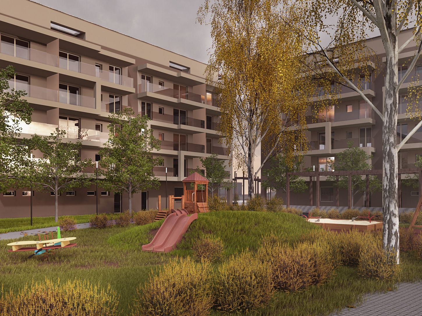 Gli edifici sono coronati da un piccolo volume che costituisce un sottotetto, avente copertura piana ed arretramenti in corrispondenza dei lati minori, per ridurre l’effetto massivo attraverso la formazione di terrazzi con pergolati lignei di forma semplice.