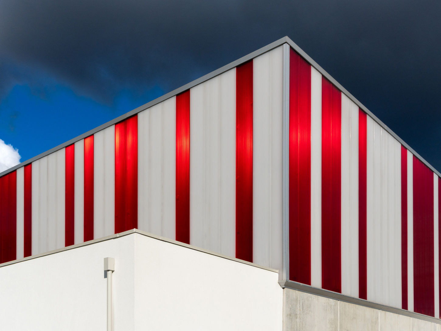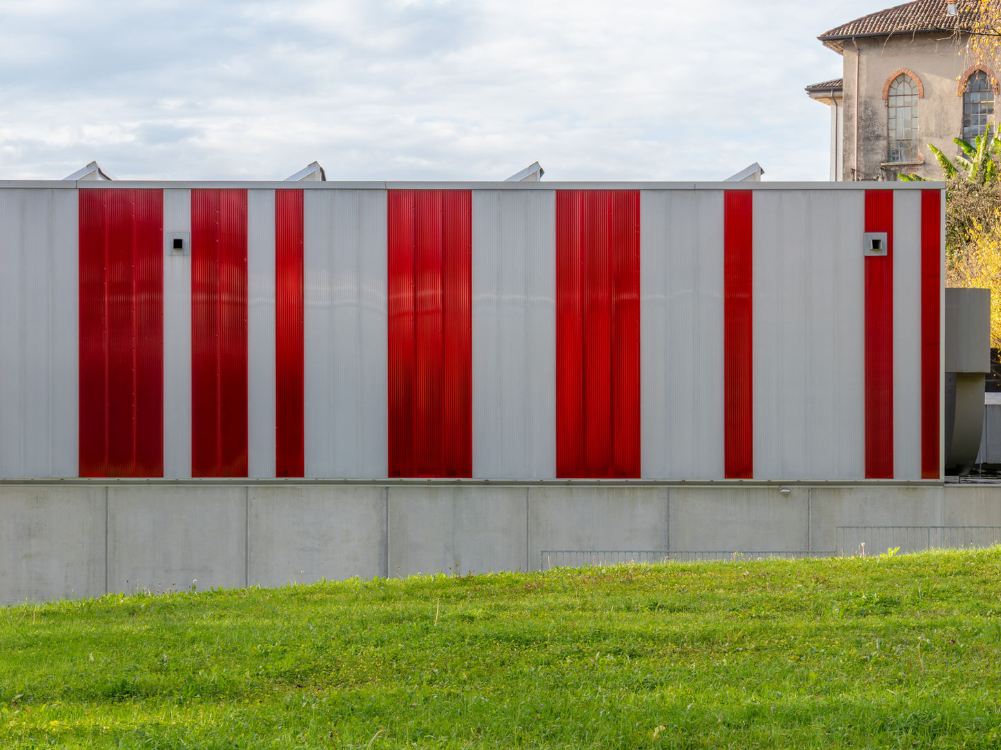 Un edificio dalla forma semplice e pulita: un basamento in calcestruzzo di circa 4 metri, capace di dialogare con il resto del complesso uniformato dal nuovo colore grigio, ed una parte superiore “più leggera”, costituita di pannelli in policarbonato alveolare.