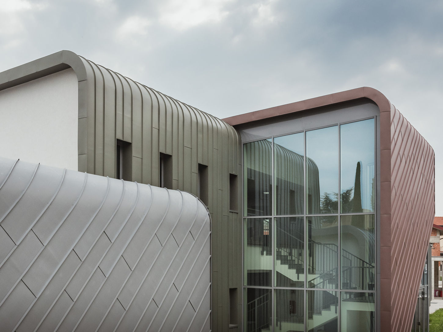 Lo zinco-titanio, nelle sue declinazioni cromatiche naturali, è impiegato per la copertura e le facciate ventilate, conferendo all'edificio un aspetto austero e prezioso, ingentilito dalle linee curve che risolvono le intersezioni tra i piani.